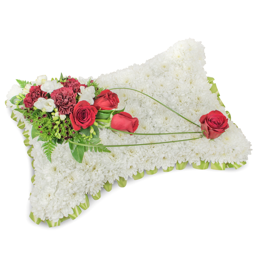 Show your sympathy with our graceful flower arrangement, designed to provide comfort and convey your heartfelt messages. This stunning bouquet features a delicate combination of white chrysanthemums, red roses, white freesias, dark red carnations, accented by dianthus and bear grass.